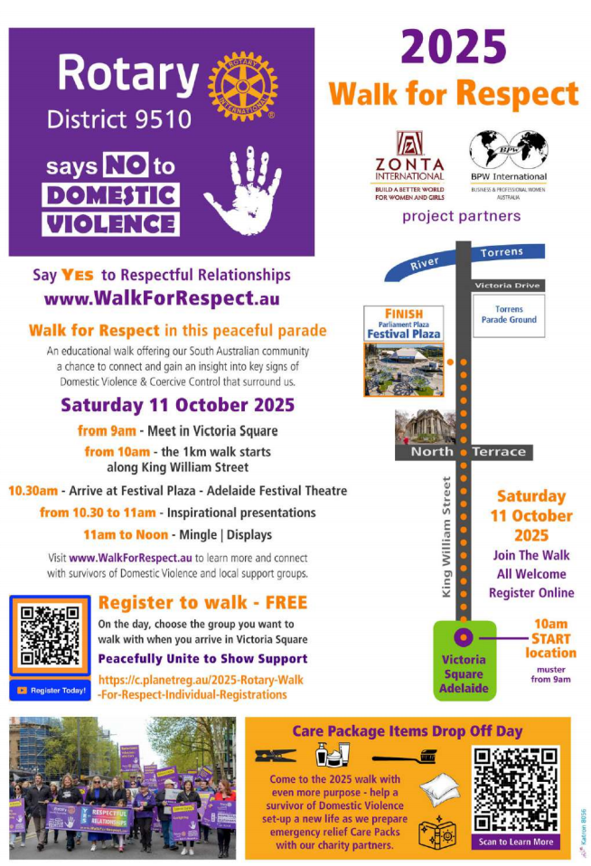 Participated in the presentation on Rotary Says NO to Domestic and Family Violence, by Martin Rowe last Tuesday night. Powerful words that are showing more and more the need to act and be involved. I do hope we can have members join the March in Adelaide on Saturday October 11th or bring items for the Care Packages that we can donate