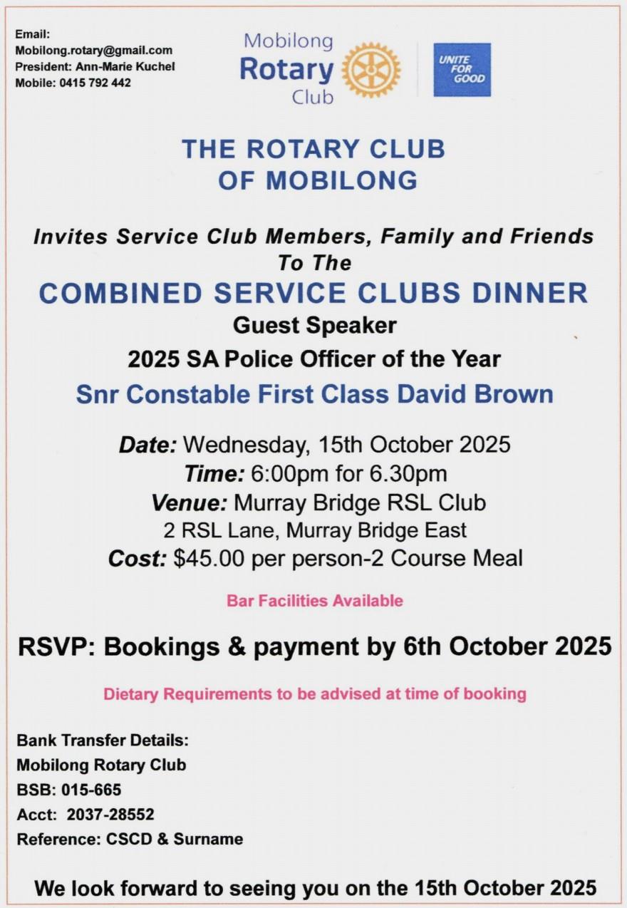 The Rotary Club of Murray Bridge gathers at the Bridgeport Hotel 2 Bridge St, Murray Bridge on Tuesday evenings. Fellowship from 6.00pm with Dinner starting at 6.15pm. Apologies or guests to be notified to Jacquie Best by 12pm Monday. 0409 377 343
