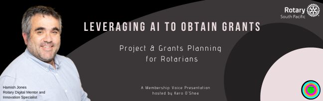 Thursday evening I attended a Zoom meeting with Hamish Jones (Past President Rotary Club of Strathmore and Public Image Chair for Rotary District 9790). His topic for this meeting was Leveraging AI to obtain grants. The audience was smaller than other AI presentations which Hamish has presented, and the content was quite specific to Global Grant writing. Hamish gave lots of examples using ChatGPT to write sections of applications using data collected from Community Analysis surveys and even asked for the work to be written with Rotary as the audience - it was good to see the examples being altered as he made further requests of the program. While I do not see myself writing a Global Grant in the near future, I have worked with AI and ChatGPT in my teaching and was inspired to see the effect it could have when wanting to write in a Rotary Context. Check out his presentations on YouTube if this topic interests you further.