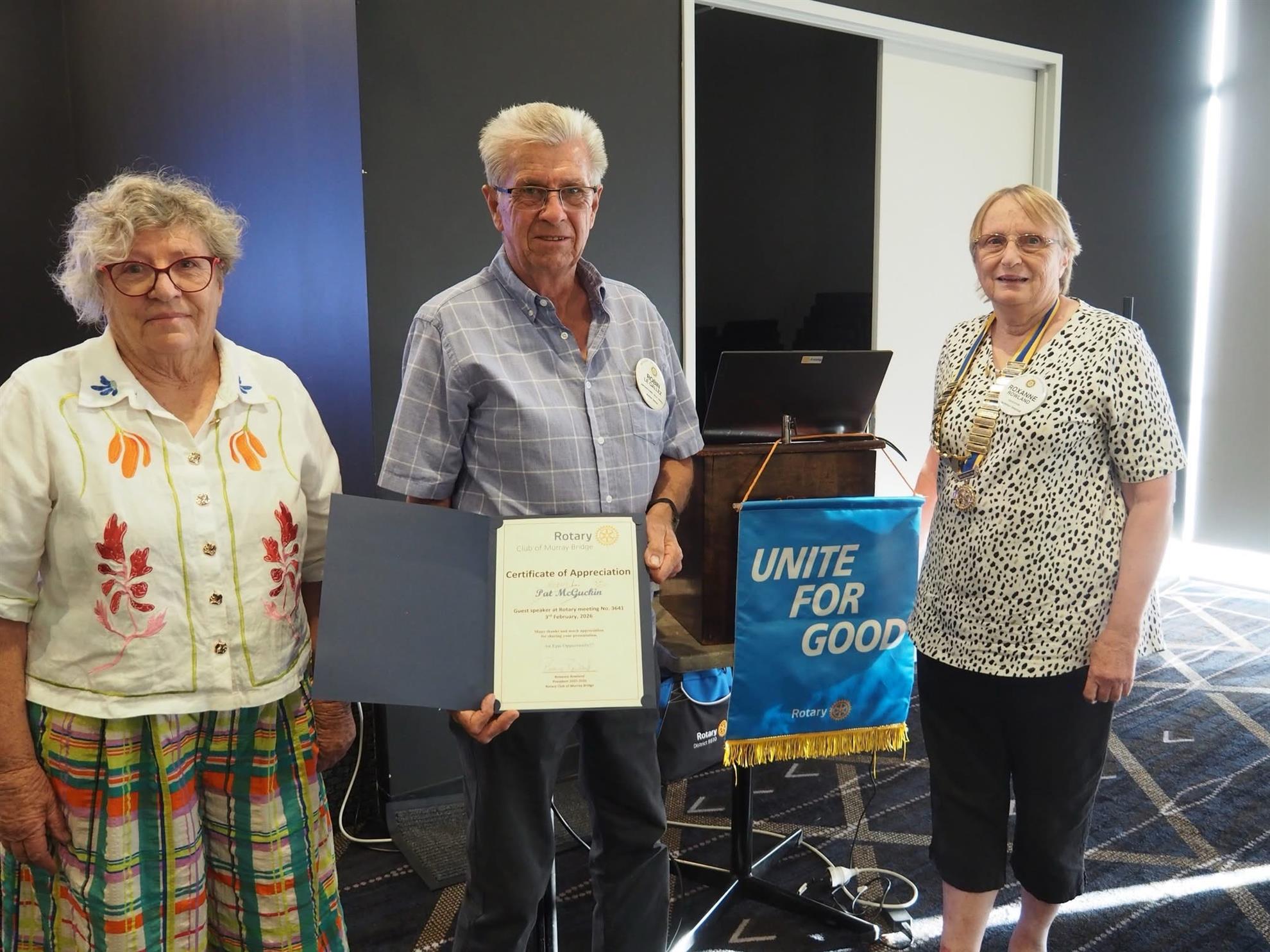 The Rotary Club of Murray Bridge gathers at the Bridgeport Hotel 2 Bridge St, Murray Bridge on Tuesday evenings. Fellowship from 6.00pm with Dinner starting at 6.15pm. Apologies or guests to be notified to Jacquie Best by 12pm Monday. 0409 377 343