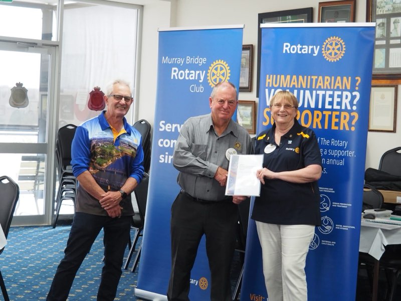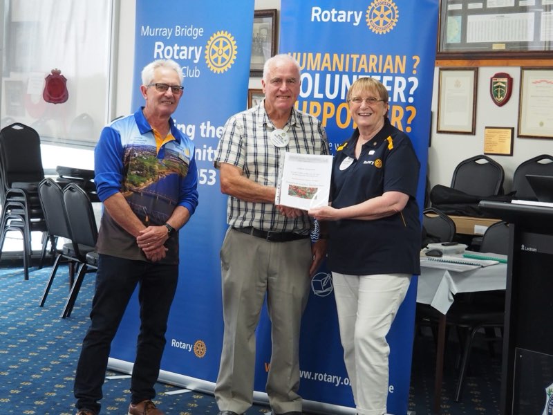 The Rotary Club of Murray Bridge gathers at the Bridgeport Hotel 2 Bridge St, Murray Bridge on Tuesday evenings. Fellowship from 6.00pm with Dinner starting at 6.15pm. Apologies or guests to be notified to Jacquie Best by 12pm Monday. 0409 377 343