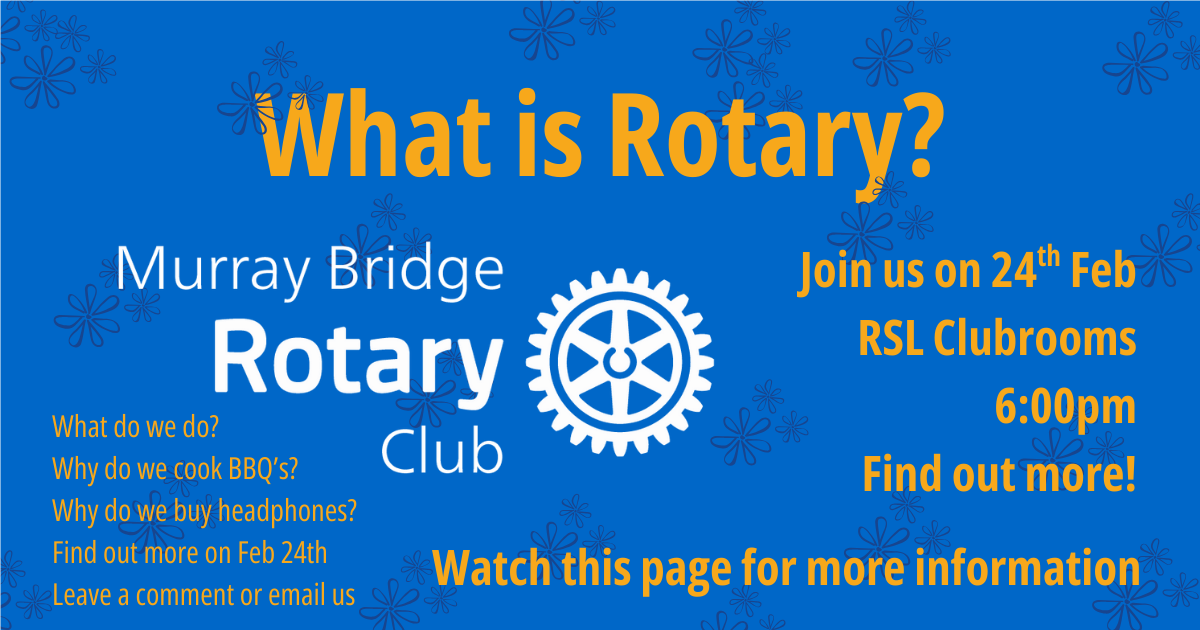 The Rotary Club of Murray Bridge gathers at the Bridgeport Hotel 2 Bridge St, Murray Bridge on Tuesday evenings. Fellowship from 6.00pm with Dinner starting at 6.15pm. Apologies or guests to be notified to Jacquie Best by 12pm Monday. 0409 377 343